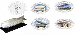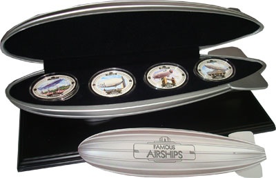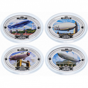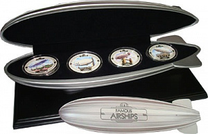 Набор монет овальной формы или формы дирижабля, в которой представлены знаменитые дирижабли 1920-х и 30-х годов. На каждой цветной монете, посвященной периоду ар-деко конца 1920-х и 30-х годов, изображен летающий знаменитый дирижабль на фоне культовой сцены международного города, с которым он ассоциировался. Монеты упакованы в футляре в форме дирижабля.