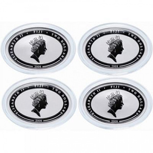На каждой монете — портрет Елизаветы II, по ободу название страны-эмитента, номинал монеты и год выпуска.