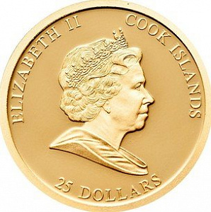 25 долларов. 2010 г. Островов Кука. Елизавета II. Сари Мултала. Au 4 г.